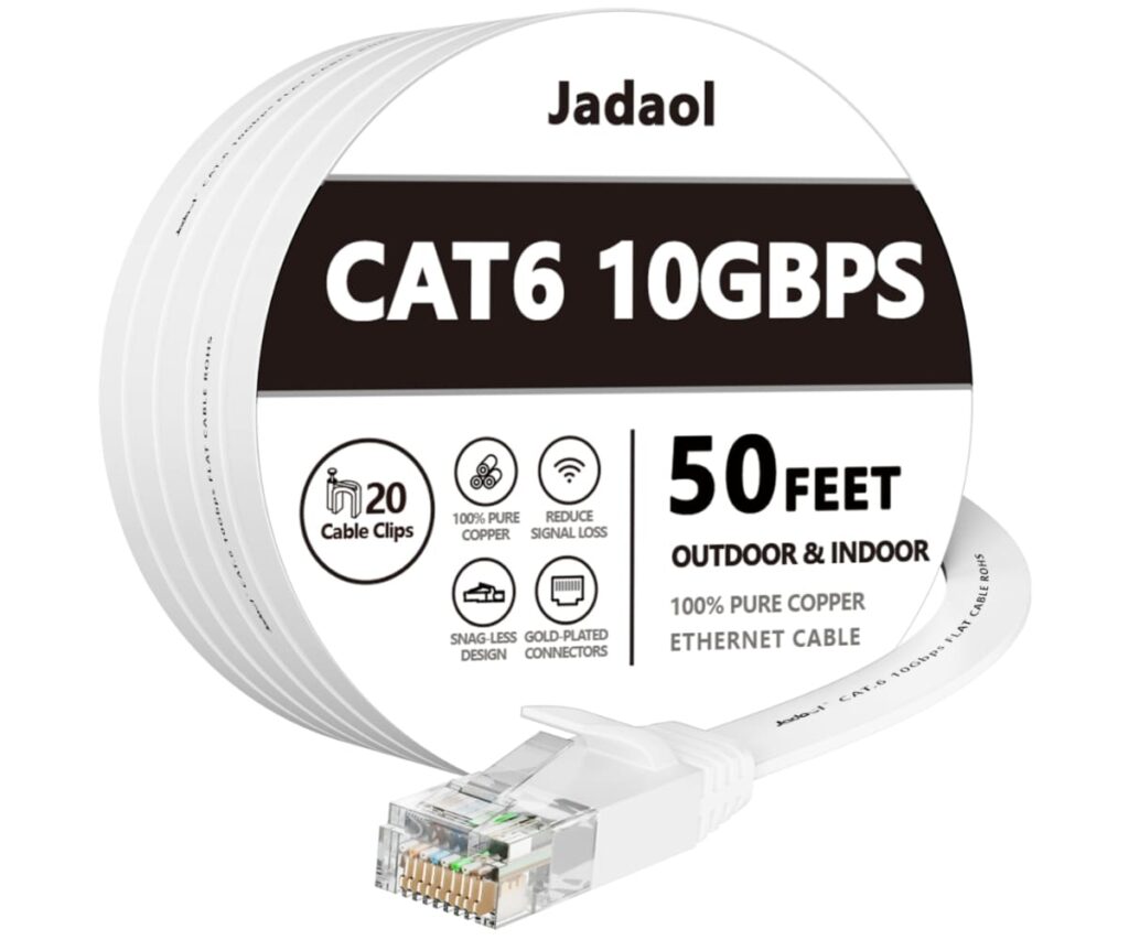 I needed a cable that could withstand outdoor conditions without sacrificing speed, and Jadaol delivered exactly that. I installed their 100ft flat Cat6 cable around my backyard for my outdoor security cameras and it’s been holding up perfectly through rain and sun. The gold-plated connectors fit snugly, and the speed hasn’t slowed down at all despite the long run. The flat shape also helped me run the cable discreetly along fences and walls. Highly recommend for anyone needing durable and fast Ethernet outdoors.